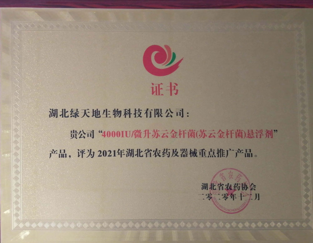 公司蘇云金桿菌懸浮劑被湖北省農(nóng)藥協(xié)會(huì)評(píng)為湖北省農(nóng)藥及器械重點(diǎn)推廣產(chǎn)品。