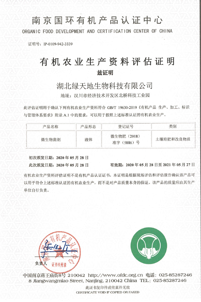 公司微生物菌劑獲得有機(jī)農(nóng)業(yè)生產(chǎn)資料評估證明