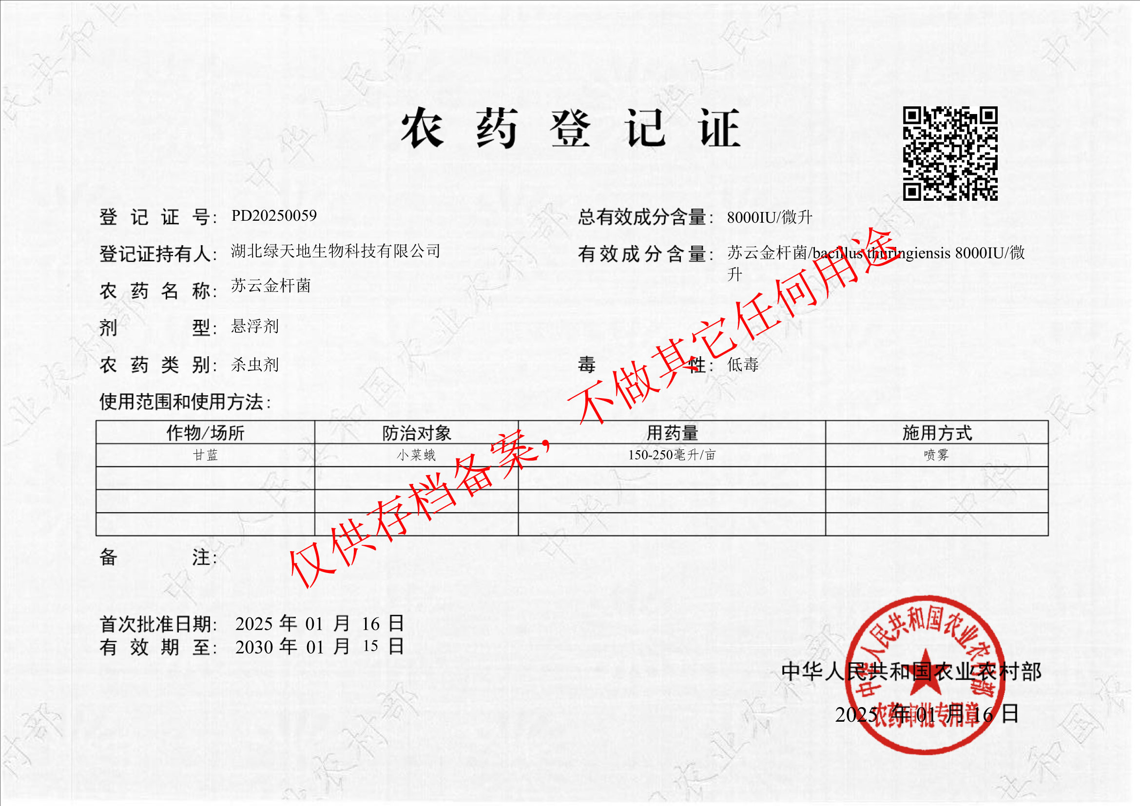 8000單位蘇云金懸浮劑農(nóng)藥登記證